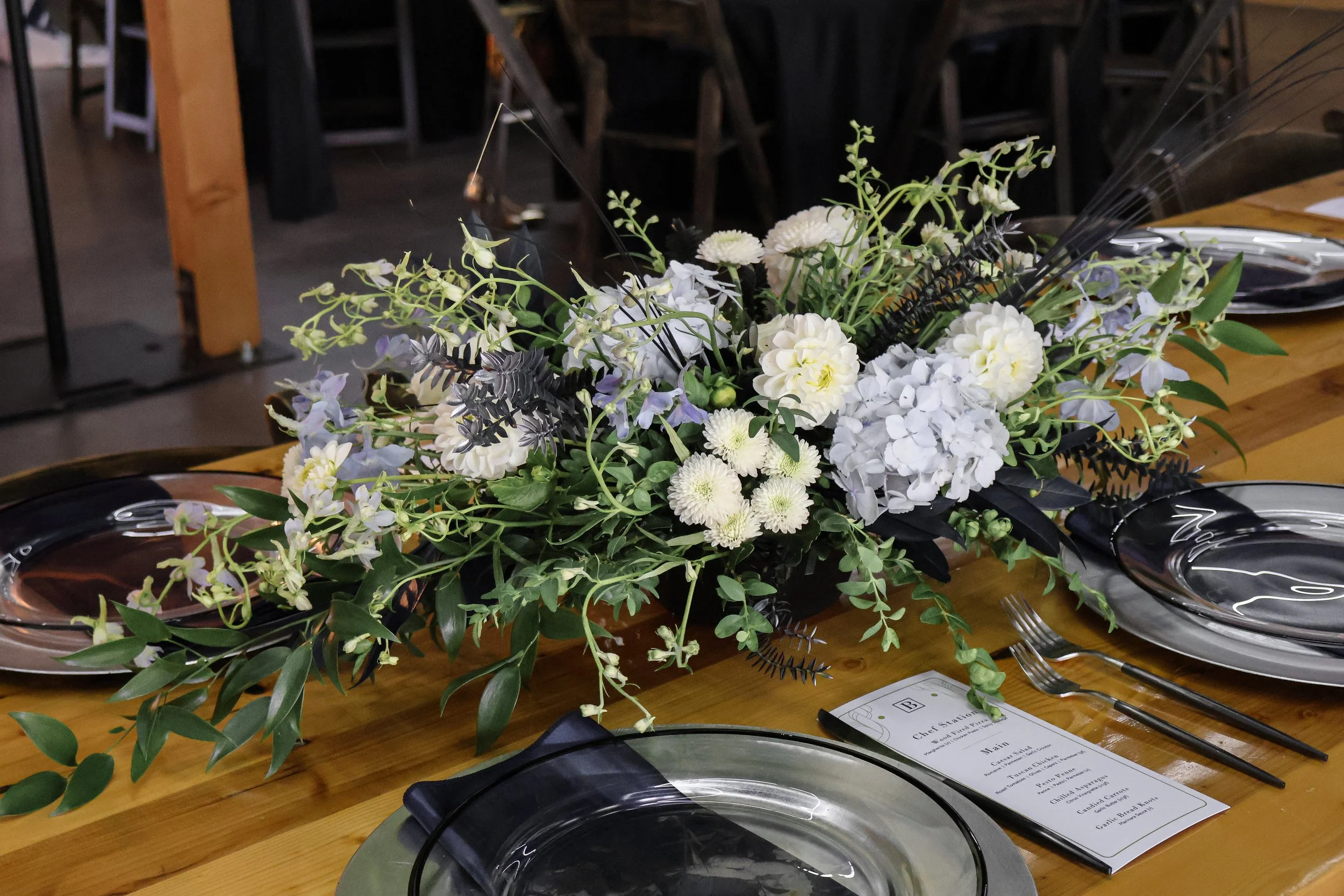 It’s not just weddings here at The Copper Dahlia! In August, I had the pleasure to be a part of the vendor team for Ben’s bar mitzvah. Danielle at Amethyst Events approached me with the task of aligning with their VIP/exclusive red carpet walk theme, with florals in blues and black tones that was still masculine, but also youthful and fun. And fun was had! I wanted to use gradients of black to grey/silver paint on greenery and dried accents in order to have something unique. To get the deeper, dark blue tones I also sprayed laurel a midnight blue and was so happy with the contrast when designed in more modern, asymmetric pieces. Keep scrolling below for all the yummy detail shots.