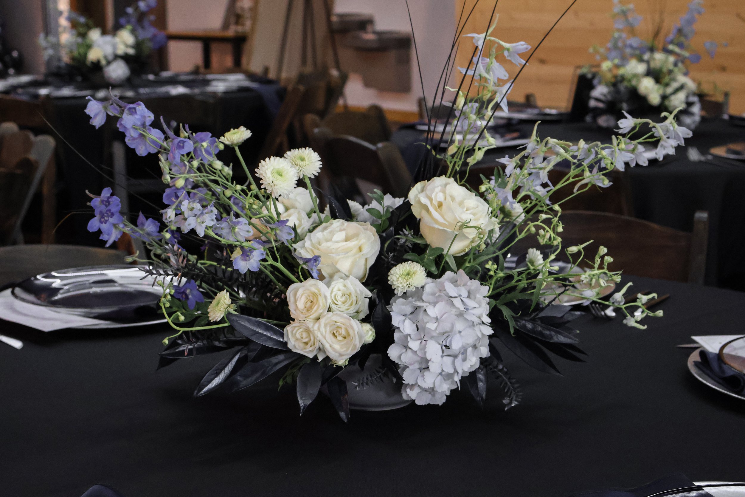 Inside the venue, a centerpiece with fun and funky sprayed accents were on round tables in an asymmetric design. I used a mix of the delphinium, roses, hydrangea, button mums, and spray roses in a grey bowl to accent the sleek black and blue table decor.