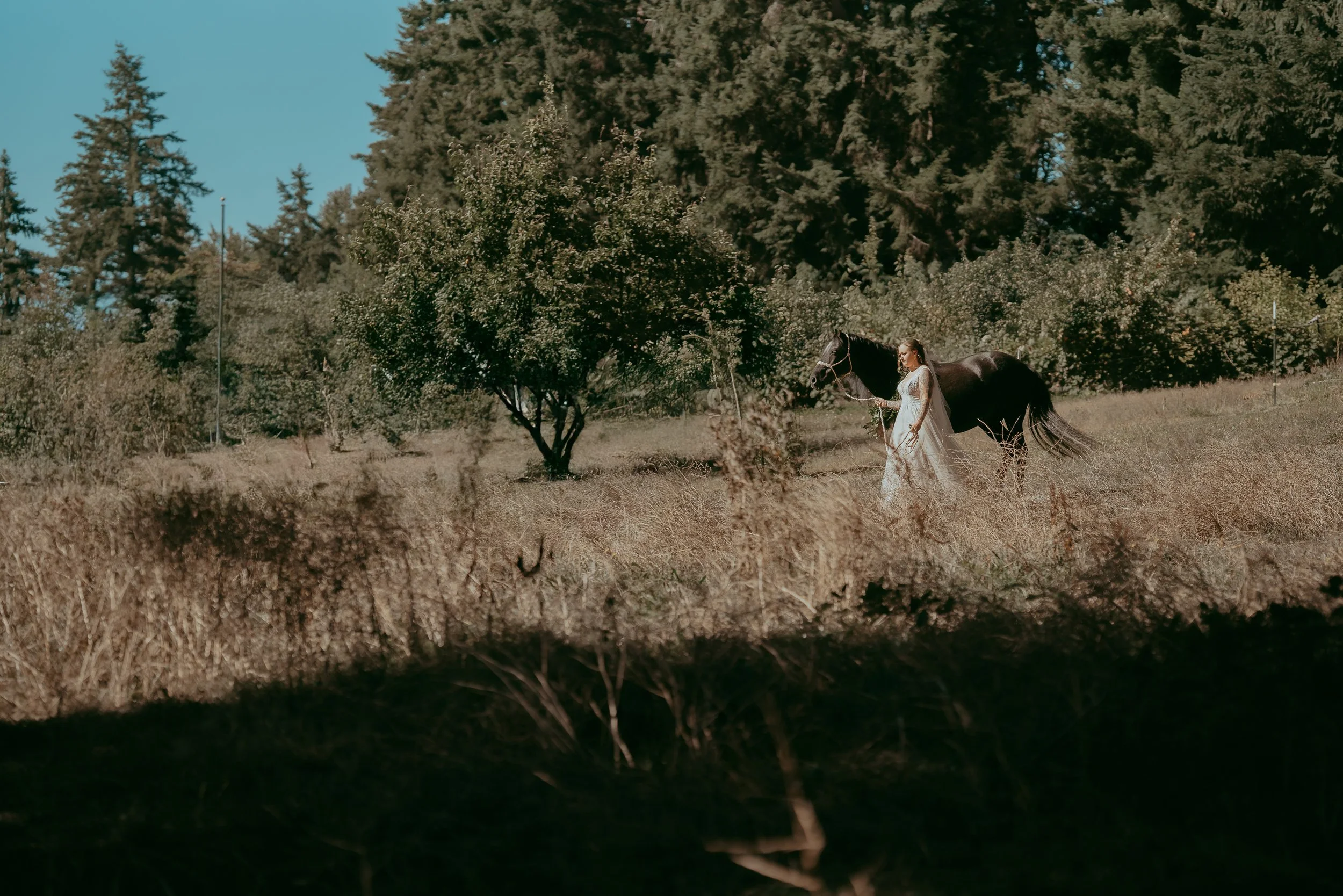 Kelsey arrived to the ceremony with a special escort named Zena, her mom’s horse that Kelsey also rides until her own horse Lu is of age. Zena wore a garland of greens with clusters of ferns, roses, and cushion mums on either side. After coming through the sunlight in the trees, she met her mom waiting at the edge of the clearing with her bouquet and made her way up the aisle where the ceremony was officiated by Kelsey’s step-dad.
