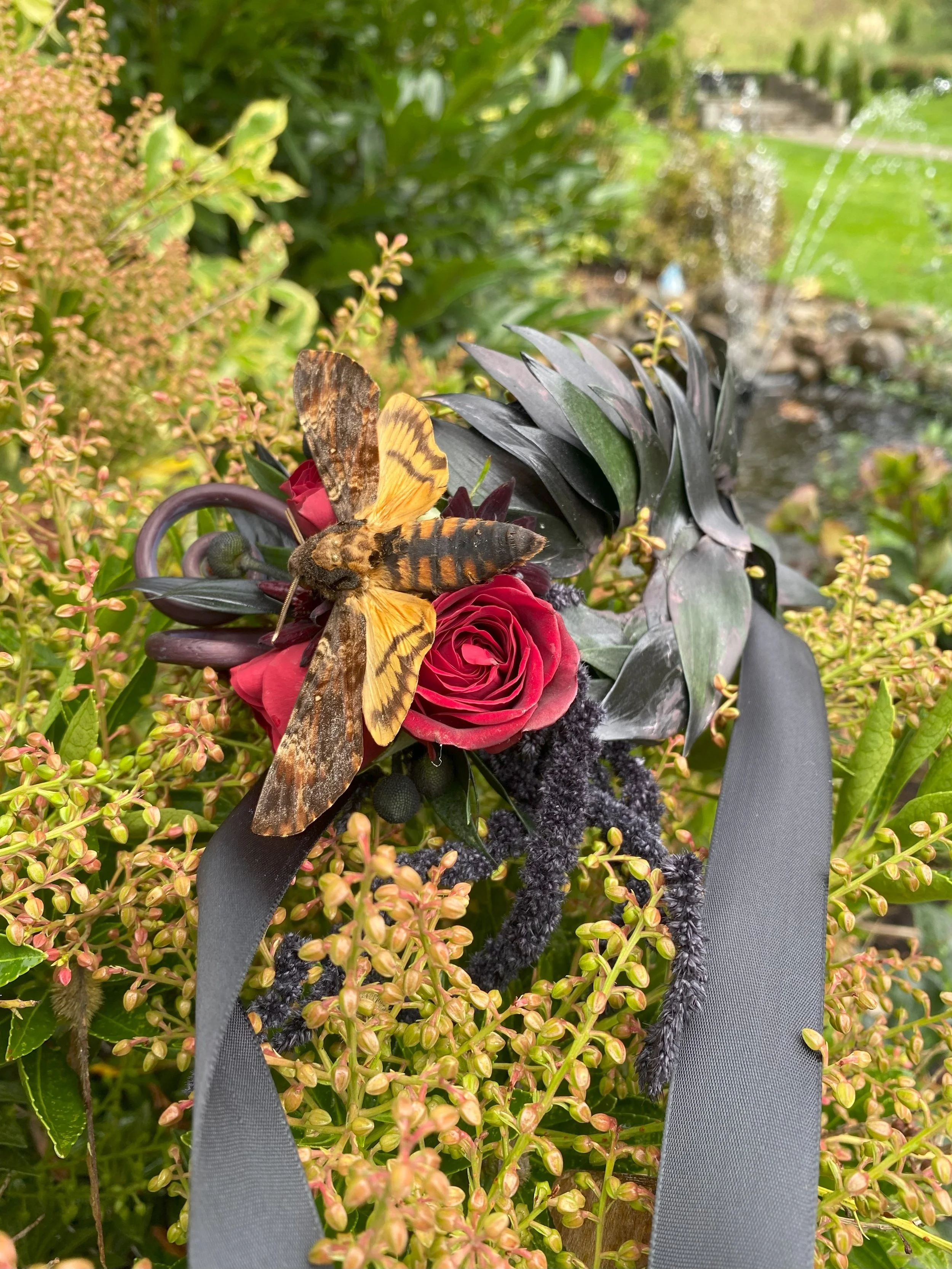 For Krystal we decided that I would make a floral mask and the end result is the most rad floral piece I’ve ever made! I ordered a Death’s Head Hawk-moth specimen for this and knew I wanted a cluster of florals on one side with preserved black hanging amaranthus hanging down. I started covering the base of a mask with individual leaves of sprayed black Italian ruscus and as I kept going they just ended up looking more and more like dragon or snake scales. To touch up any floral glue spots and give it some dimension I lightly brushed a bit of the black/brown paint over some of the black leaves. The floral cluster was red spray roses, chocolate cosmos, preserved black hanging amaranthus, brown fern curls, and black anemone pods. I used the specimen pins on the moth to secure straight on top of the floral cluster, but moved the pins so they would be right over the “eyes” of the death’s head marking.