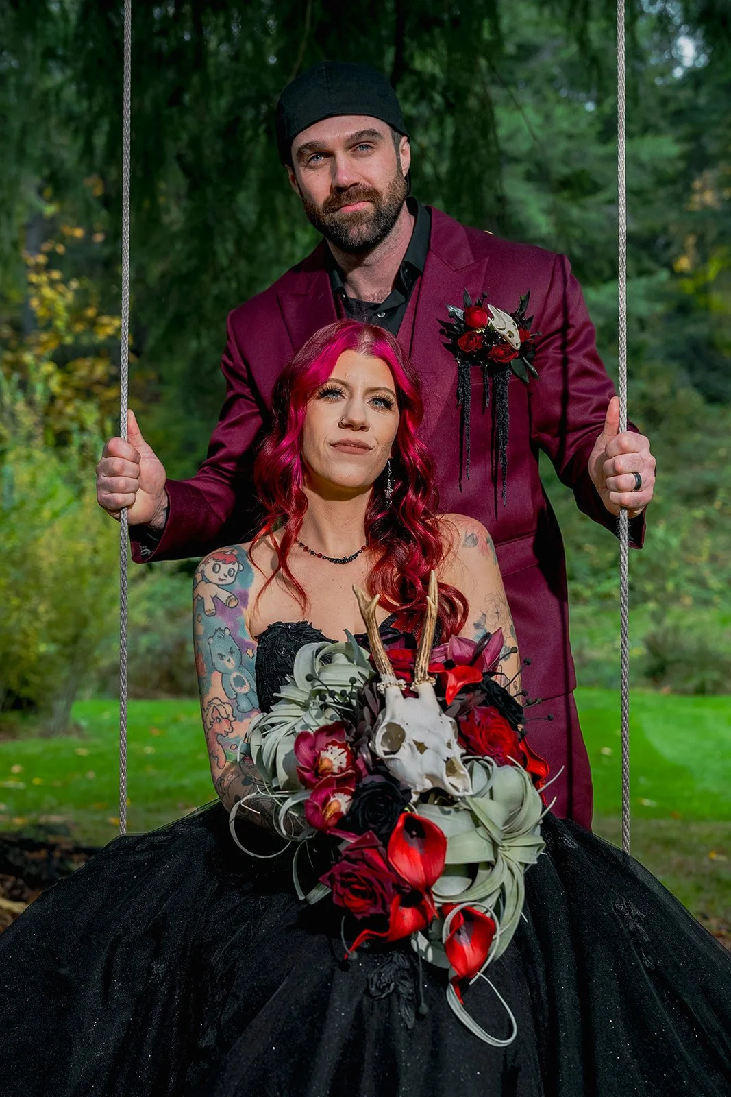 Krystal’s bridal bouquet was a cascade that centered around the skull with antlers. Two tillandsia (air plants) shaped the top round and the bottom point with their little curls. I used a faux red cala lily and hand painted the black/brown centers. Other elements included ebony leucedendron, burgundy cymbidium orchids, dyed black roses, black bacarra roses, uluhe (brown fiddlehead fern curl), and Japanese anemone pods in black.