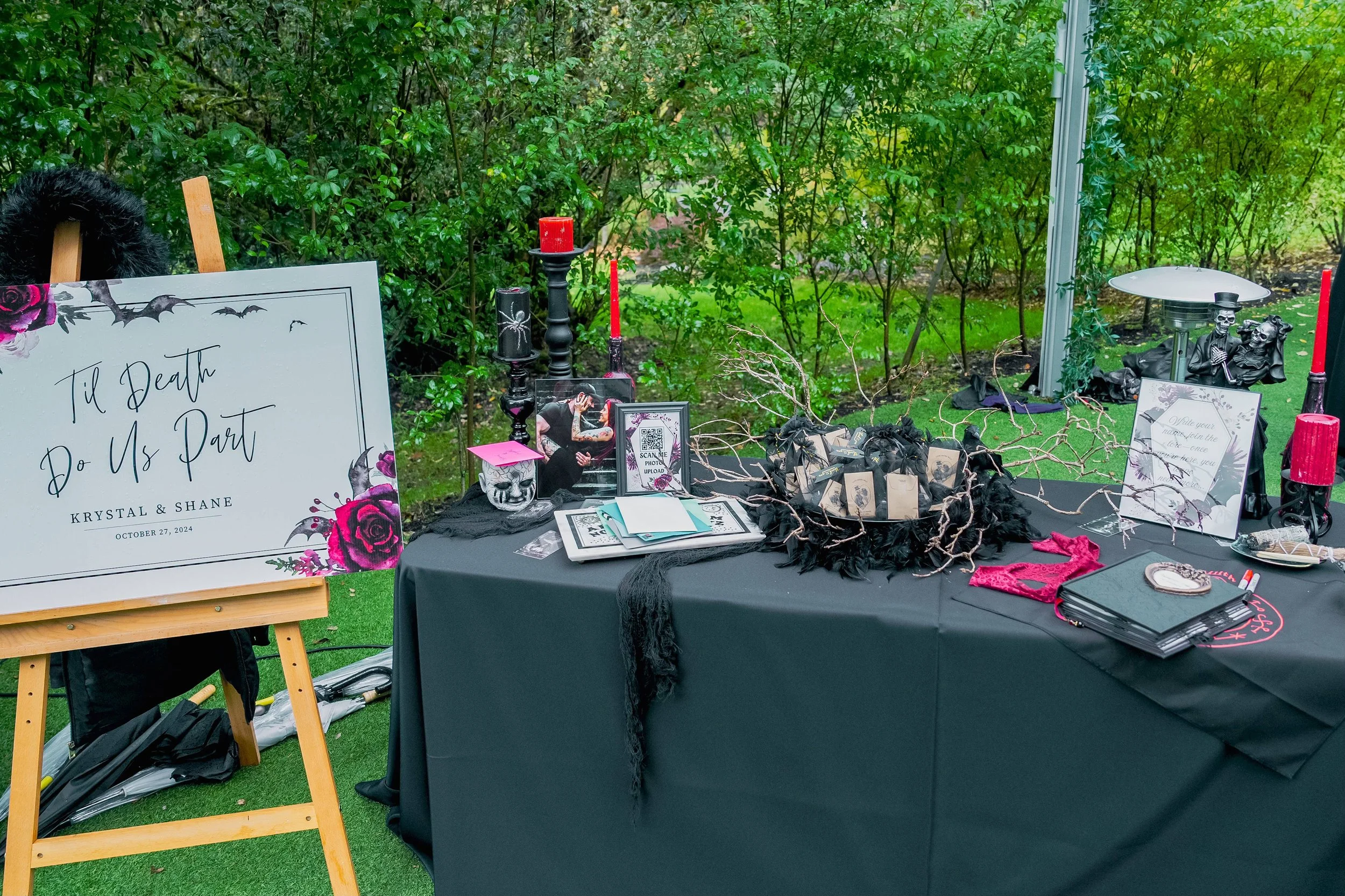 On the welcome table, Krystal had a black feather wreath that I added branches to, to emulate a crow’s nest and hold their little seed pack and skull candle favors.